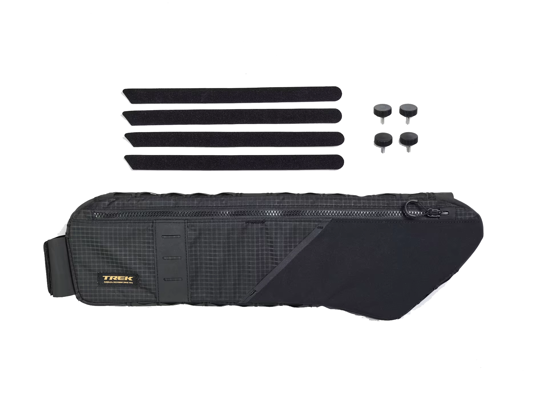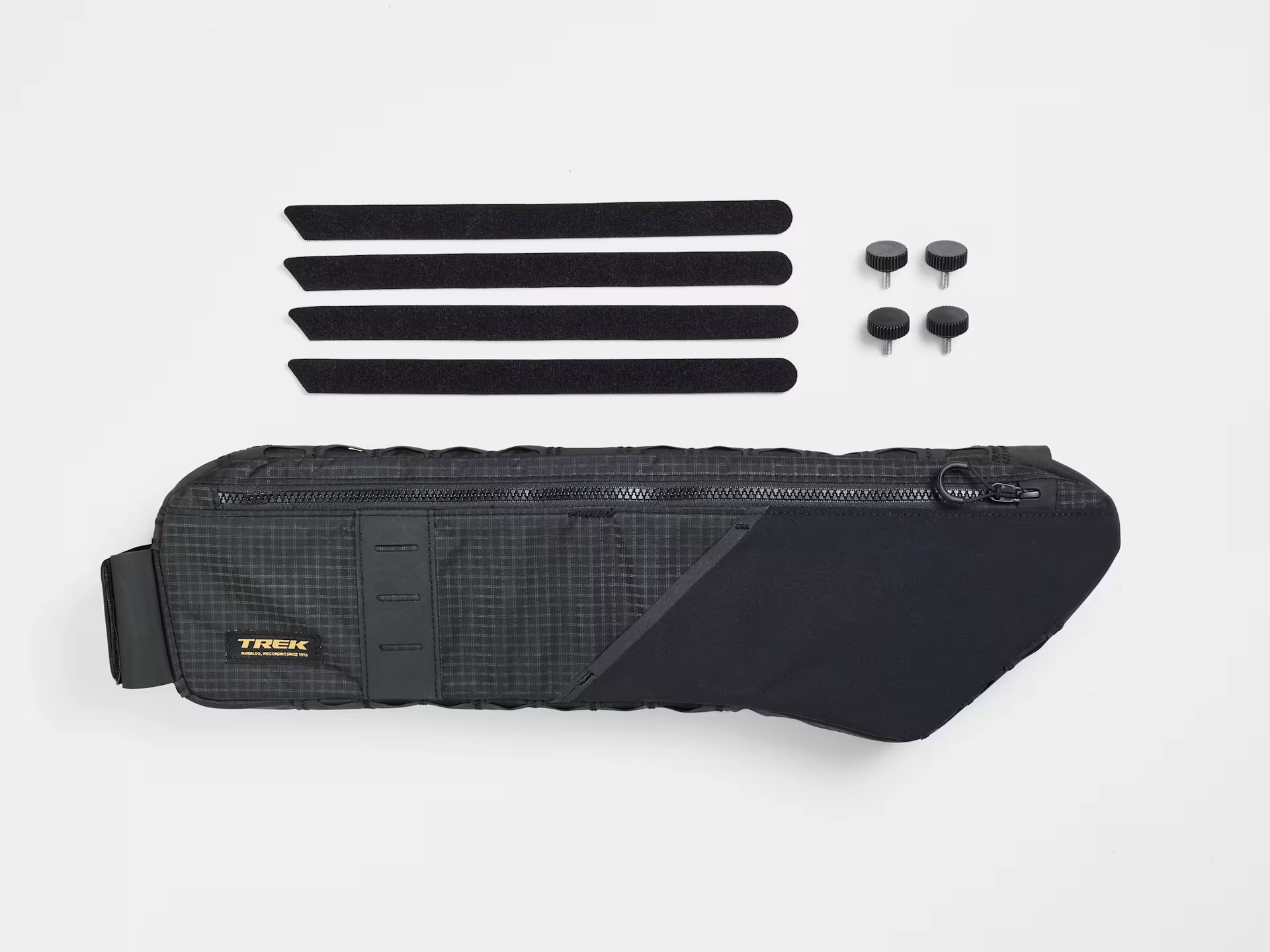 Z tak dopracowaną torbą zapomina się o bagażach. Torbę na ramę Trek Adventure, umieszczoną pod rurą górną, można bezpiecznie przymocować do roweru za pomocą śrub radełkowanych lub pasków, dzięki czemu można zabrać ze sobą cały sprzęt oraz przekąski i akcesoria potrzebne na każdą przygodę.